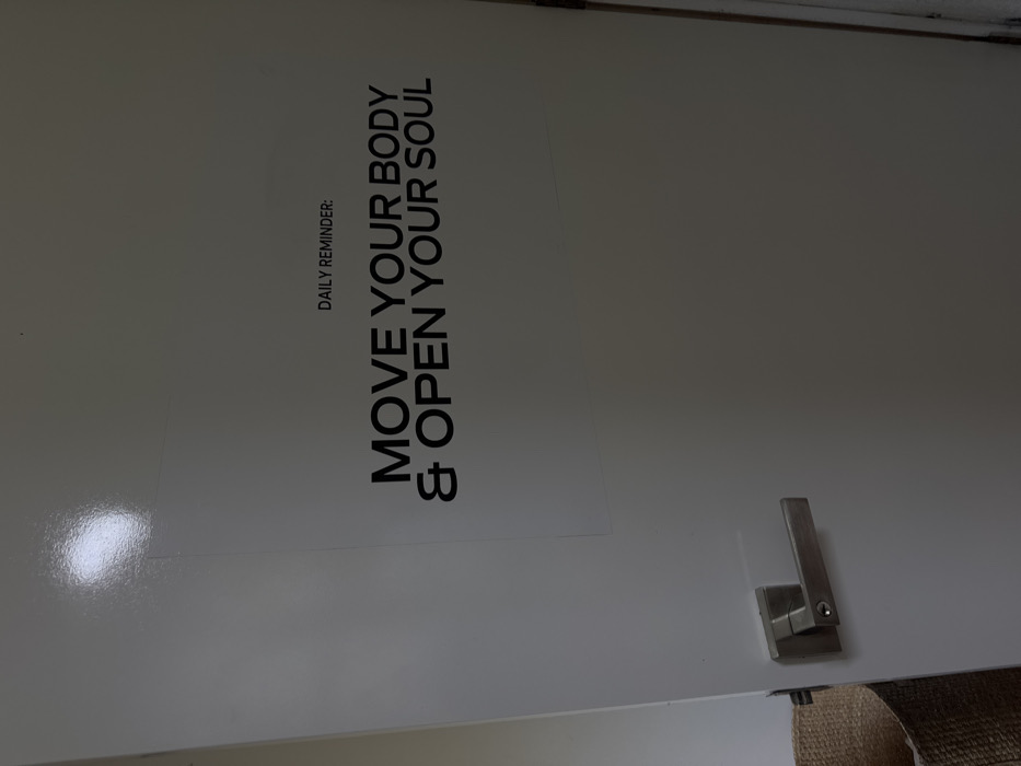 The image displays an interior view of a white, slightly ajar door located in Cuernavaca, Mexico. A rectangular white sticker is affixed to the upper central portion of the door, featuring black sans-serif text that reads: "DAILY REMINDER: MOVE YOUR BODY & OPEN YOUR SOUL". Below the text, a brushed metallic door handle with a square escutcheon is horizontally positioned on the door's left side. A light source reflects as a bright glare on the upper left quadrant of the door surface. To the immediate left of the door, a portion of a light-brown, woven basket is visible on the floor. No individuals are present in the scene.