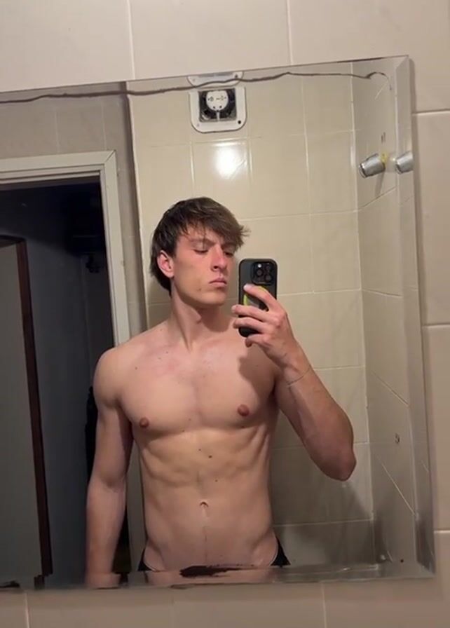 In a medium shot, a young, light-skinned man is seen in a bathroom, taking a mirror selfie. He is shirtless, revealing a toned physique with defined abdominal muscles. His hair is light brown and styled with a fringe falling over his forehead. He's holding a black smartphone in his right hand. The bathroom has a tiled wall and an outdated exhaust fan on the ceiling. In the mirror's reflection, a doorway leading into a darker area is visible. At one point, he flexes his left arm. The overall lighting in the bathroom is bright.