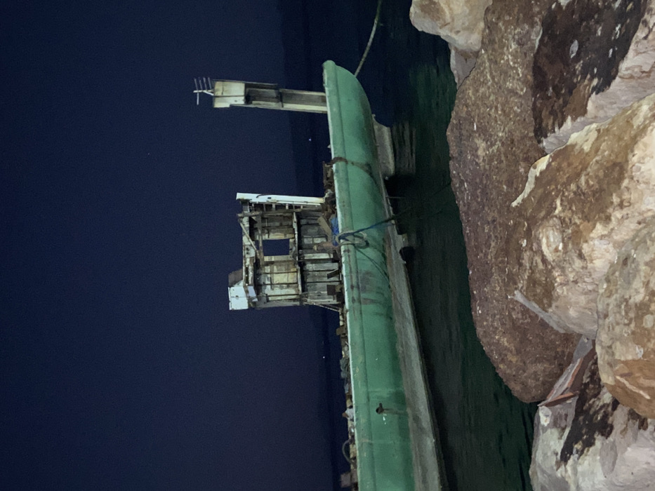 A partially submerged, damaged ship rests against a rocky shore at night. The ship's hull is green and marked with decay, featuring a skeletal superstructure exposed to the elements. Its frame reveals inner compartments. Next to the ship, large, textured rocks create a natural barrier. The dark sky contrasts with the dimly lit scene, emphasizing the vessel's derelict state. The ship's proximity to the rocks suggests a shipwreck or intentional grounding.