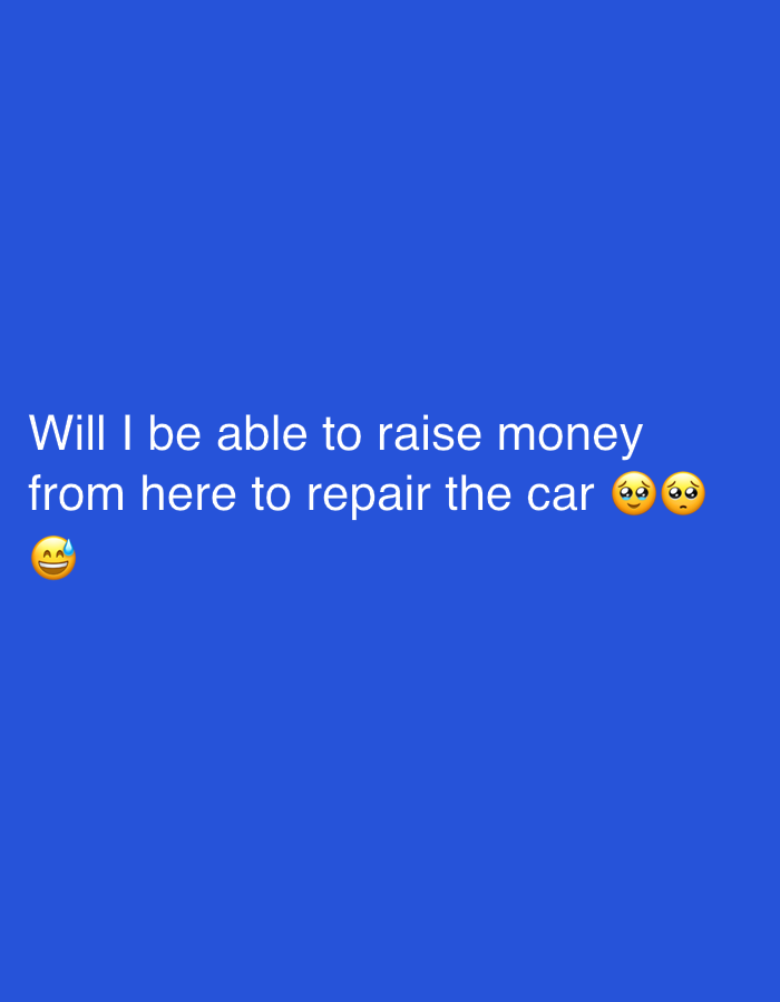 The image displays white text on a solid blue background. The text reads, "Will I be able to raise money from here to repair the car," followed by a pleading face emoji, another pleading face emoji, and a grinning face with sweat emoji.