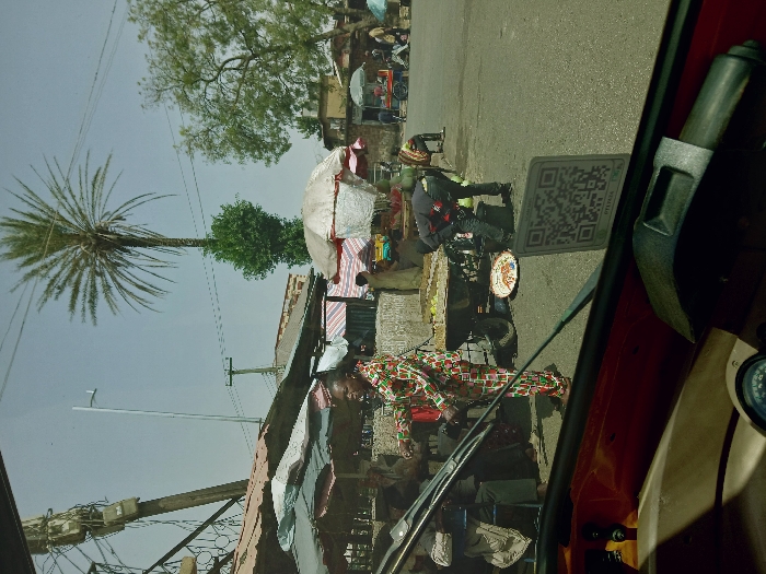 The image depicts an active outdoor market scene, viewed from the interior of a vehicle, likely a tricycle or similar. **Location:** The specific location of "Kungulu School, Zambia" is not identifiable within the frame. The scene is an urban or semi-urban street market. **Environment:** The sky is clear and bright, indicating daytime. A paved road occupies the foreground and mid-ground. Buildings, some with metal or red roofs, line the background. Multiple utility poles with electrical wires and transformers are visible on the left, alongside a tall, modern street light pole. A prominent tall palm tree with green foliage stands against the sky in the mid-right, with a smaller bushy tree below it. Another large, leafy green tree is on the far right. **People:** - Approximately six to eight individuals are present in varying degrees of clarity. - In the mid-ground, a person wearing a distinct full-body outfit patterned with red, green, and white geometric shapes stands facing slightly right, positioned near market stalls. - To the right of this person, another individual in dark clothing (dark shirt, dark pants) is bent over, attending to items on the ground near a wheeled wooden cart. - Other individuals are partially visible behind market stalls on the left and further down the street on the right, engaged in various market activities such as standing, walking, or tending stalls. **Subjects/Objects:** - **Vehicle Interior (Foreground):** A portion of a dark red/orange vehicle dashboard, including a gauge cluster and a black handlebar or control lever, is visible. A black windshield wiper arm extends across the lower-mid portion of the frame. A white square sticker with a QR code and the text "DTLL1424" is affixed to the windshield on the right. - **Market Stalls:** Several makeshift market stalls are set up along the left and mid-ground, covered by various awnings and umbrellas (grey, red/white striped, plain white). - **Merchandise:** A wheeled wooden cart, located in the mid-ground center, is laden with produce, possibly green fruits or vegetables. On the ground near the cart, a colorful round platter holds additional items, alongside a dark bucket. **Actions/Interactions:** Individuals are engaged in typical market activities, including tending stalls, interacting with merchandise, and moving through the area.