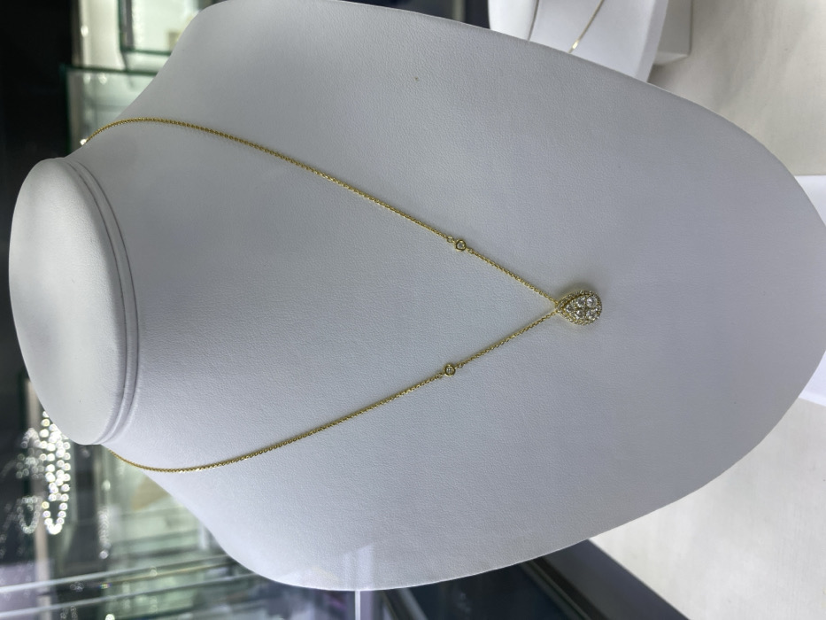 A gold necklace is displayed centrally on a white, neck-shaped jewelry stand within a retail establishment in Santa Cruz de la Sierra, Bolivia. The necklace features a delicate gold chain with a teardrop-shaped pendant at its center. The pendant is composed of multiple small, clustered round brilliant-cut diamonds or diamond simulants set in gold. The chain itself is accented with two small, bezel-set round brilliant-cut diamonds or diamond simulants on each side, positioned equidistant from the pendant. The background is out of focus, revealing blurred reflections and indistinct shapes characteristic of illuminated glass display cases containing additional jewelry items. No people are visible.