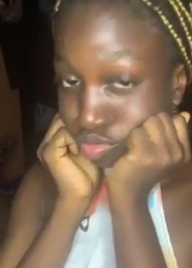 young woman with dark skin, braided hair, and brown eyes looking directly at the camera. She is wearing a white halter top with a floral pattern in shades of blue, orange, and green. Initially, she holds her hands near her face, then she removes them and looks at the camera. The background is dimly lit, showing a glimpse of a room with a wall, some hanging items, and an indistinct object on a table.