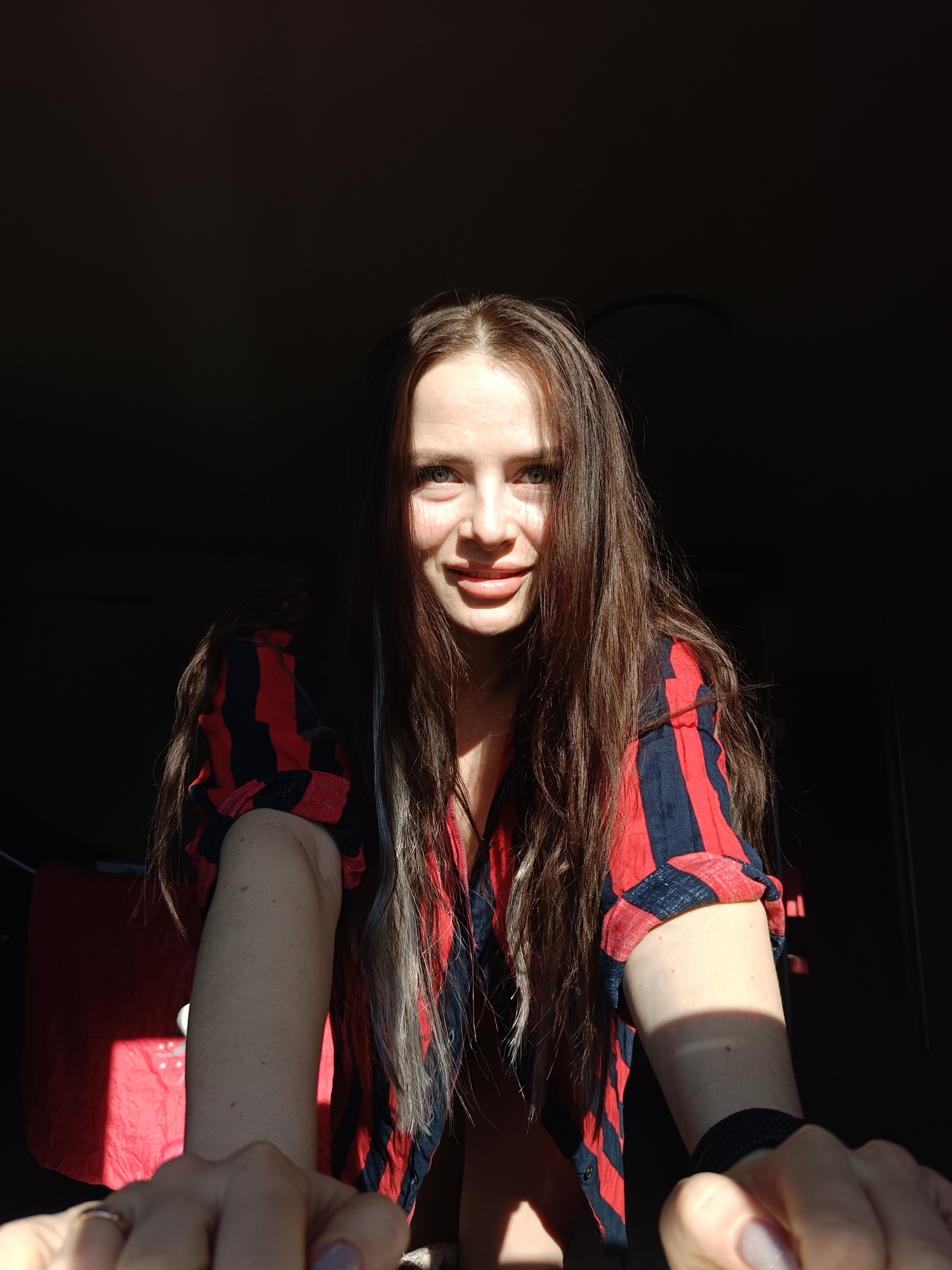 A woman with long brown hair and blue eyes, wearing a red and blue striped shirt, is positioned in front of a dark background. Sunlight illuminates the right side of her face and arm. Her hands are outstretched towards the camera. The photograph may have been taken indoors. There is no information available to confirm the location is Rusalevka, Russia.