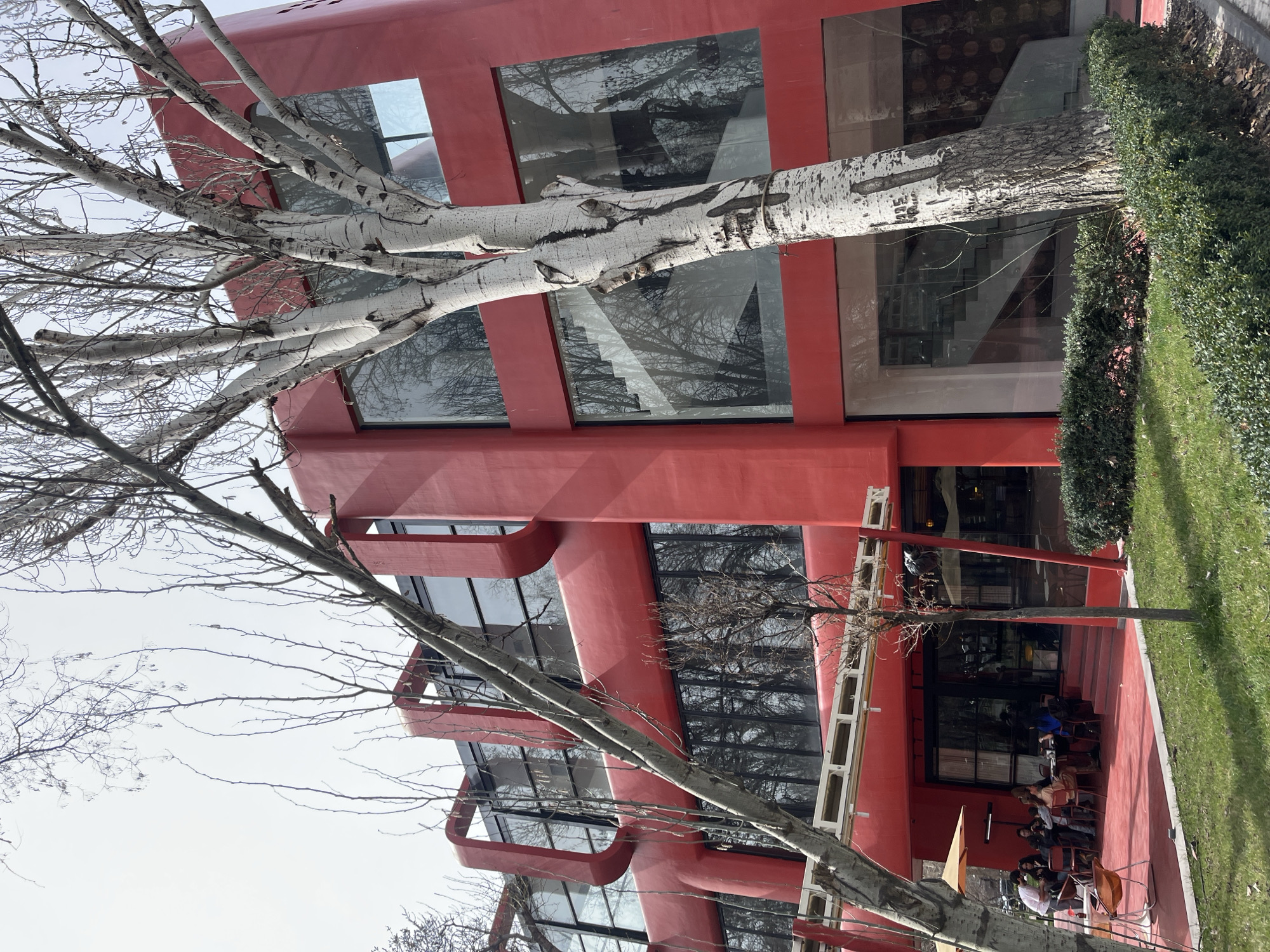 The image displays a multi-story building with a distinctive matte red exterior located in Yerevan, Armenia. The structure features prominent dark-tinted, rectangular windows across its facade, reflecting the surrounding environment, including bare tree branches and the sky. Rounded, U-shaped red architectural elements frame windows on the upper levels. In the foreground, several bare-branched deciduous trees with light-colored, patterned bark partially obstruct the view of the building. To the left of the building's ground-level entrance is a red-colored outdoor patio area where approximately 10-15 individuals are seated at dark tables, engaging in dining and conversation under yellow umbrella awnings. A server in a white shirt attends to a table. An empty orange chair is positioned in the lower-left foreground. A patch of green grass and low, neatly trimmed green hedges line the area in front of the building. Through a large window on the ground floor to the right, an interior staircase with a glass railing is visible. The scene is brightly illuminated by natural daylight under a clear sky.