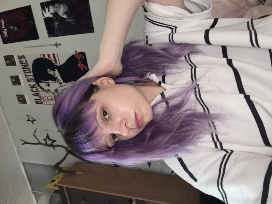 The image depicts a young individual, appearing female, with light skin and long, wavy purple hair, darker roots, and bangs
