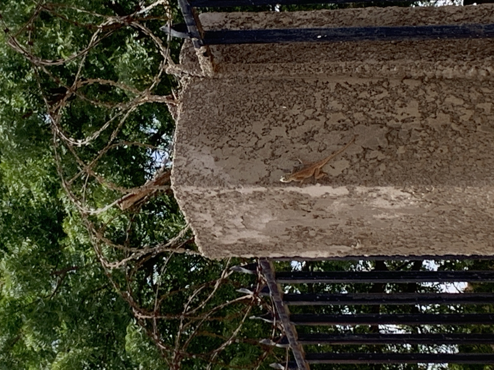 The image displays a security barrier in an outdoor, daylight setting in Ilorin, Nigeria. A substantial, light brown, textured concrete pillar occupies the central and right portions of the frame. To the right of the pillar, a dark metal fence with vertical bars and pointed top finials is partially visible. Entangled atop both the pillar and the fence is a dense network of rusted, coiled razor wire, serving as an anti-climbing deterrent. Adhering to the left face of the concrete pillar is a small, light tan-colored lizard, oriented vertically with its head facing upwards. The background features lush green foliage from trees, indicating a vegetated environment beyond the immediate barrier. No human subjects or active interactions are present in the scene.