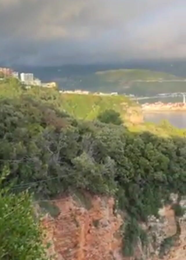 From the perspective of a high vantage point, the camera pans across a coastal landscape. Initially, the view features buildings atop a lush, green hillside, with a cloudy sky overhead. As the camera moves, the scene transitions to reveal a dramatic coastline with steep, reddish cliffs, topped with vegetation, descending into turquoise waters. A prominent rock formation covered in greenery sits just offshore. In the distance, a city skyline is visible across the bay, beneath a cloudy sky. The overall scene suggests a peaceful, natural setting.