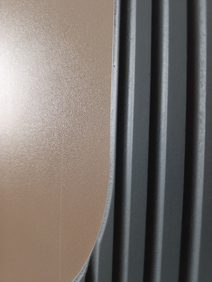 The image presents an abstract close-up of two distinct material surfaces. On the left, occupying approximately two-thirds of the frame, is a flat, tan-beige surface with a fine, granular texture. A soft, diffuse highlight is visible on its upper-left area. The right edge of this tan surface forms a smooth, concave curve. Adjacent to and right of this curve is a dark gray surface characterized by parallel, vertical ridges or flutes, which cast shadows and highlights, indicating a three-dimensional profile. The two surfaces meet along a clean, defined edge that appears slightly textured. No individuals, animate subjects, specific objects beyond these two materials, or any actions or interactions are present within the frame. The scene is recorded as being located in the city of Tut, Uzbekistan.