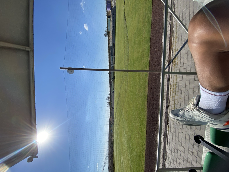 A sunny day at a stadium. Green grass contrasts with the blue sky behind a safety net. The sun glares from the lower left, partially obscured by an overhanging structure. A person's leg and foot, clad in a white sock and sneaker, rest on a green stadium seat, visible in the right side of the frame, and overlooking a brick path. Metal railings separate the path from the field.