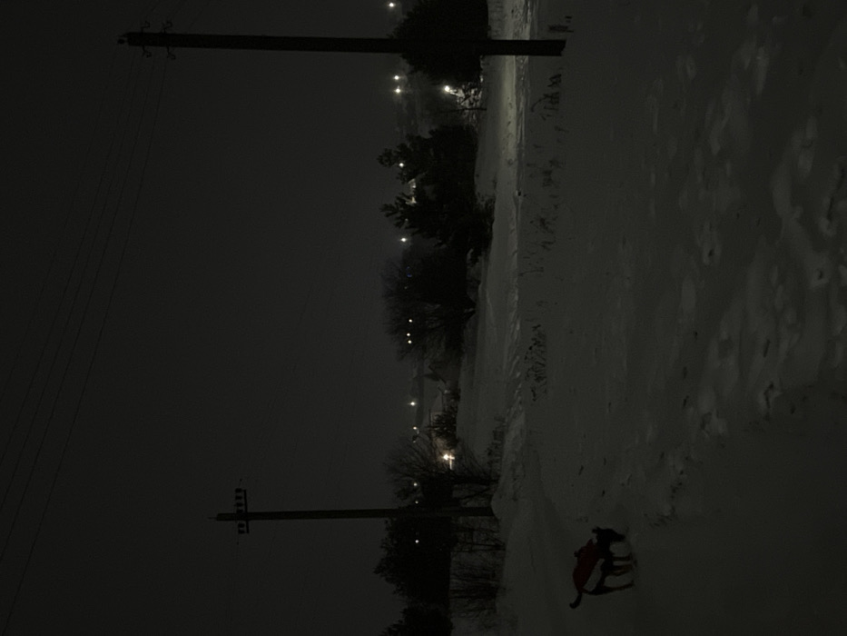 A nighttime scene showcases a snowy landscape illuminated by distant streetlights. A dog, possibly wearing a red coat, stands in the foreground. Telephone poles with wires extend across the left side of the frame. Bare trees and bushes dot the horizon, silhouetted against the night sky. The perspective is slightly tilted.