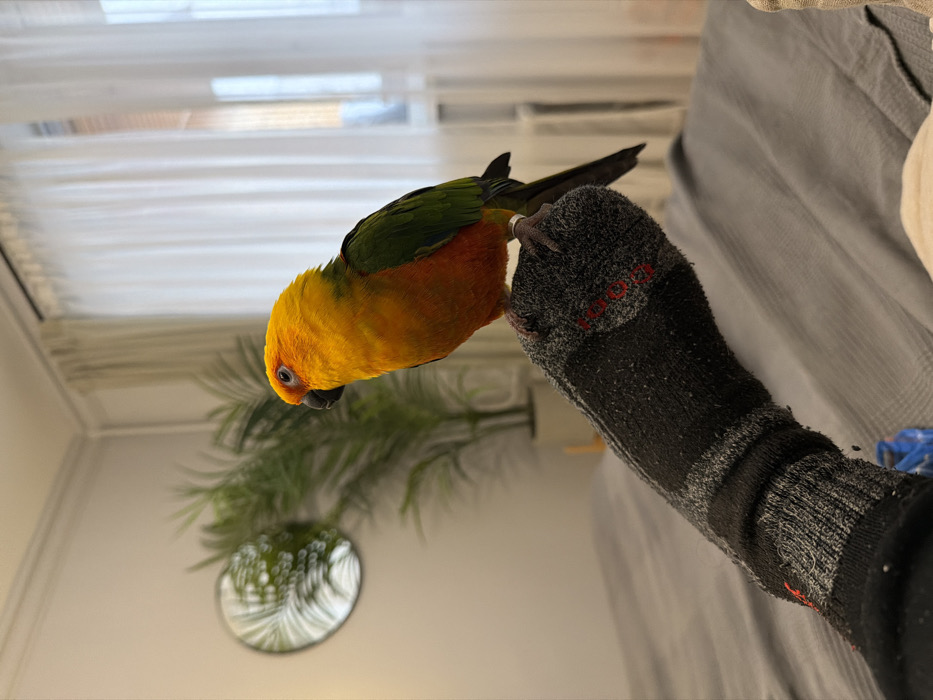 - "A Sun Conure parrot, characterized by its orange and yellow head and chest transitioning to green wings and back, with a black beak, is perched on a human foot" by FM-e1BLf2, licensed under CC BY 4.0