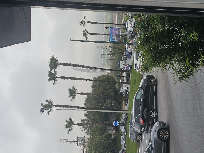 The view is from a window onto a street with palm trees lining a grassy median. Cars are parked along the side of the road and other cars are driving in the distance. There are also some buildings and a cell tower visible in the background. The sky is overcast.