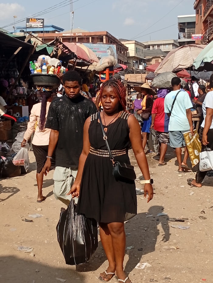 A woman in a black dress with braided red-tinted hair walks through a crowded outdoor market. She carries a black bag and wears sandals, a necklace, a watch, and a small black purse. A man in a black shirt and light pants walks behind her. Overhead, stalls are covered by awnings, and various signs are visible in the background, including "ADA Gentle" and "Washington Plaza." The ground is littered. Other people are also walking in the market.