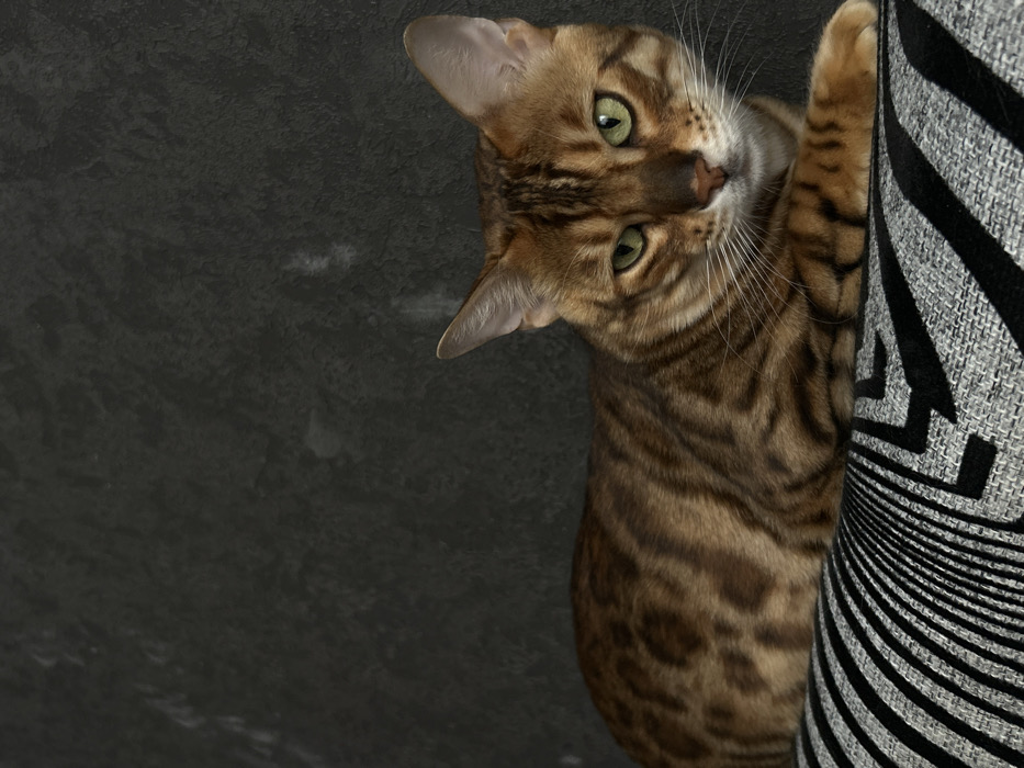 The image presents an indoor scene located in the city of Chusovoy, Russia. A single Bengal cat is positioned in a recumbent posture, facing the observer directly. The feline exhibits a short-haired coat with distinct dark brown rosettes and stripes over a tan and light brown base. Its irises are green, and it possesses a dark brown nose and prominent white vibrissae extending from its muzzle. The cat's anterior limbs are extended forward, resting on a textile surface. This surface features a monochrome geometric pattern of stark black and white or dark grey stripes and angular shapes, possibly indicating a cushion or upholstery. The background consists of an unadorned, dark grey wall with a subtle, irregular texture. Illumination is uniform and diffuse throughout the scene.