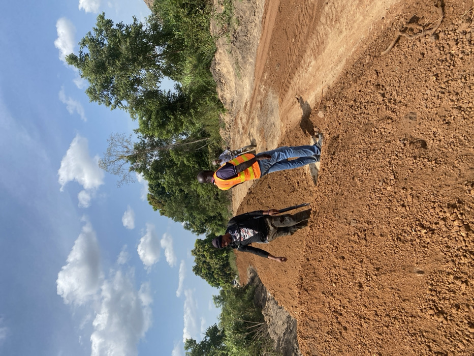 Two men stand along a reddish-brown dirt embankment bordering a dirt road