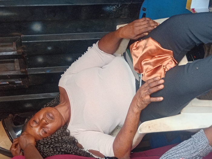 An adult female is depicted seated in a light-colored, armless chair within an informal setting in Ayangba, Nigeria. She wears a light-colored top with pearl-like embellishments on the sleeves and dark trousers. Her head is tilted backward, her eyes are partially closed, and her mouth is slightly agape. Significant swelling and purplish discoloration are evident around her left eye. A separate hand, belonging to an unseen individual, is positioned on her forehead, seemingly offering support. A crumpled, orange-colored, shiny fabric item rests on her lap. The background consists of a dark, vertically paneled or corrugated surface, possibly metallic. A blue object and a small box are partially visible on the ground to her lower right.