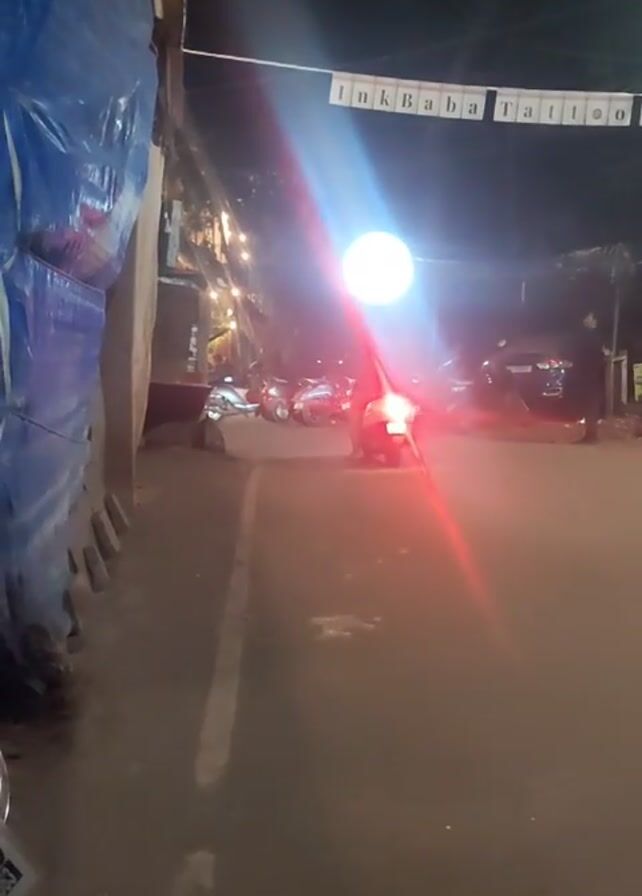 The video depicts a street scene at night. A blue tarp covers an object on the left side of the frame. Overhead, a string banner reads "Ink Baba Tattoo". Down the street, there are parked scooters and a dark-colored car. A scooter is driving away from the camera, its brake lights glowing red. A bright light source is shining down the street, causing glare. A person stands near the car. The road is dark and appears to be made of asphalt.