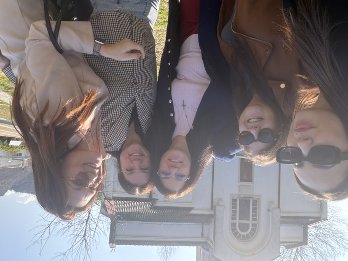The image displays five adult females grouped together outdoors in the city of Unknown, Bulgaria, under bright, direct sunlight. They are positioned closely, facing the camera, likely posing for a photograph. The background features a large, light-colored building, possibly a church, characterized by an arched window and a prominent facade. Sparse, bare tree branches are visible to the left and right of the building, with distant hills appearing on the right side of the frame. From left to right: 1. A female with long dark hair, wearing rectangular black sunglasses. A small facial piercing is visible below her left eye. Her attire is partially obscured but appears dark. 2. A female with dark, shoulder-length hair and round, dark sunglasses. She is smiling and wears a tan or brown jacket. 3. A female with dark hair and clear-rimmed eyeglasses. She is smiling, dressed in a dark blue coat over a light pink top, with a silver cross pendant visible. 4. A female with dark hair and clear-rimmed eyeglasses. She is smiling, wearing a black and white checkered blazer over a dark top and light blue jeans. Her left arm is positioned around the female to her right. A watch is visible on her left wrist. 5. A female with long reddish-brown hair and light-colored framed sunglasses. She is smiling and wears a light beige coat. She holds a black handbag in her left hand, and her right arm is positioned around the female to her left. The subjects exhibit smiling facial expressions, except for the leftmost individual whose expression is neutral. Their close proximity and physical interaction suggest a social gathering.