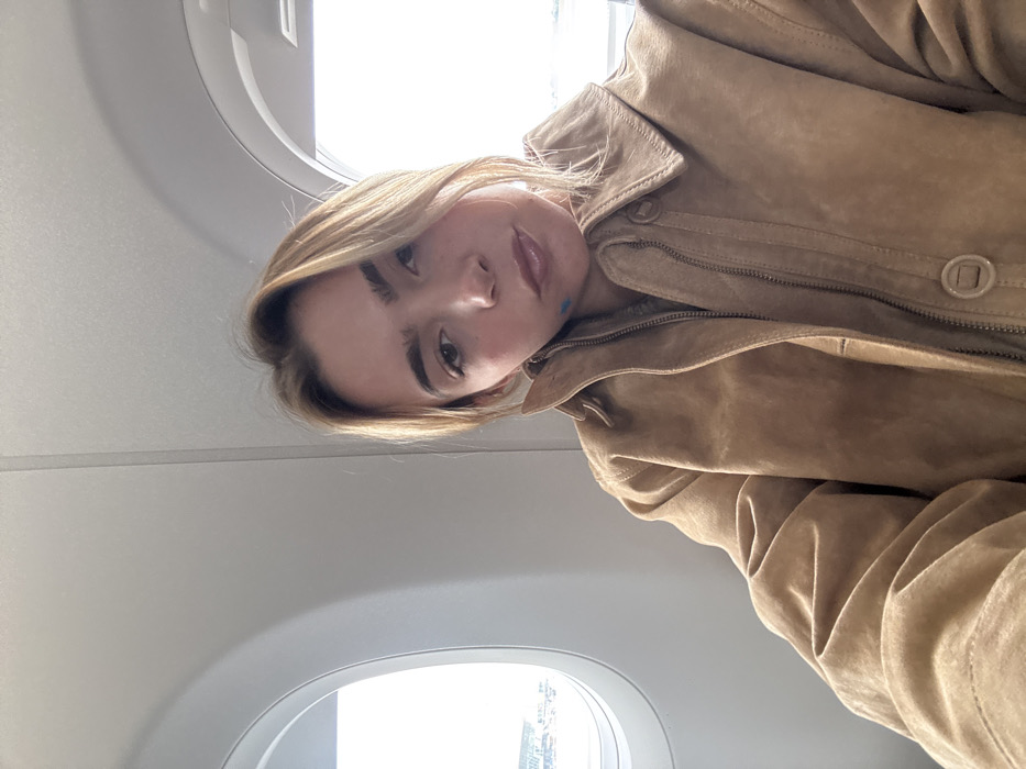 A female individual is depicted in a selfie, positioned within the cabin of an aircraft