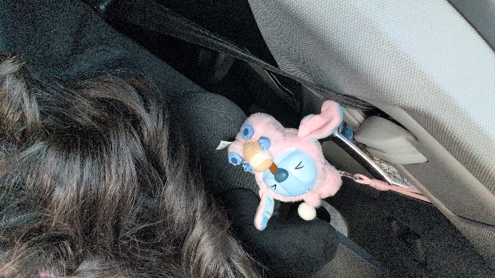 The image captures the interior of a vehicle, located in Venray, Netherlands. A pink and light blue plush toy is suspended by a pink cord attached to a metal hook. The hook is affixed to the vehicle's interior, positioned near a light grey seatbelt pillar trim and the visible seatbelt webbing. The plush toy features a blue face with two large blue eyes, pink bunny-like ears, and is depicted holding a small, light brown and white bottle-like object in its blue-gloved hands. The lower right quadrant of the image displays dark, wavy human hair, indicating the presence of a person seated within the vehicle. The background consists of dark-colored vehicle interior upholstery.
