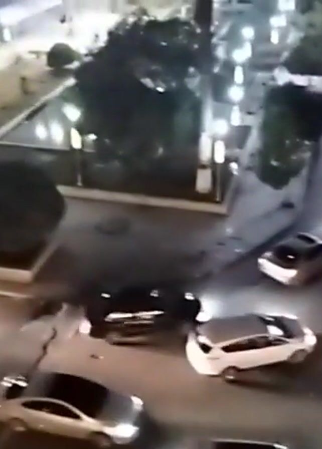 nighttime aerial view of a city square. The square is lit with streetlights and has a few small garden beds with shrubs. Several pedestrians are visible walking around the square. The square is bordered by a street with cars driving on it. There are several cars parked on the side of the street. The camera zooms out slightly to reveal a building in the background behind the square. The video is relatively steady.