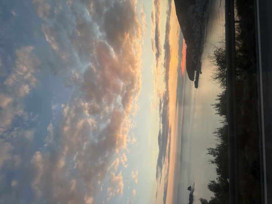 The image presents an elevated, panoramic view of the Budva Riviera in Montenegro during sunset. The sky, occupying the upper two-thirds, features scattered altocumulus and stratocumulus clouds illuminated by the setting sun with warm orange, pink, and yellow tones near the horizon, fading into a pale blue overhead. The Adriatic Sea fills the mid-ground, exhibiting a calm surface that reflects the sky's colors. On the far left, two small, dark rocky islets are visible above the water. To the right, the city of Budva sprawls along a crescent-shaped bay, climbing the lower slopes of a vegetated hill. A visible harbor within the bay contains multiple small vessels. The sun's disk is largely obscured by clouds and the distant landmass, appearing as an intense orange glow near the right horizon, directly above the city. The foreground consists of a dark, horizontal metal guardrail, indicating the viewpoint is from an elevated coastal road. Immediately above the guardrail, sparse, dark green shrubs and low-lying vegetation are visible. No human figures or specific actions are discernible. The perspective is consistent with a vantage point from the Jadranska magistrala (Adriatic Highway) overlooking Budva, likely from the northwest, facing southeast towards the city and its bay.