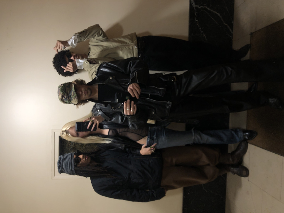 Four people pose in an indoor setting with a tiled floor and white walls. The top person is wearing a tan jacket and black pants, holding up a middle finger. Below, a man wears a black leather jacket, pants, and a camouflage cap. Further down, a blonde woman takes a selfie in a leather jacket and jeans. At the bottom, a person in a black jacket, brown pants, a blue head covering, and sunglasses completes the group.