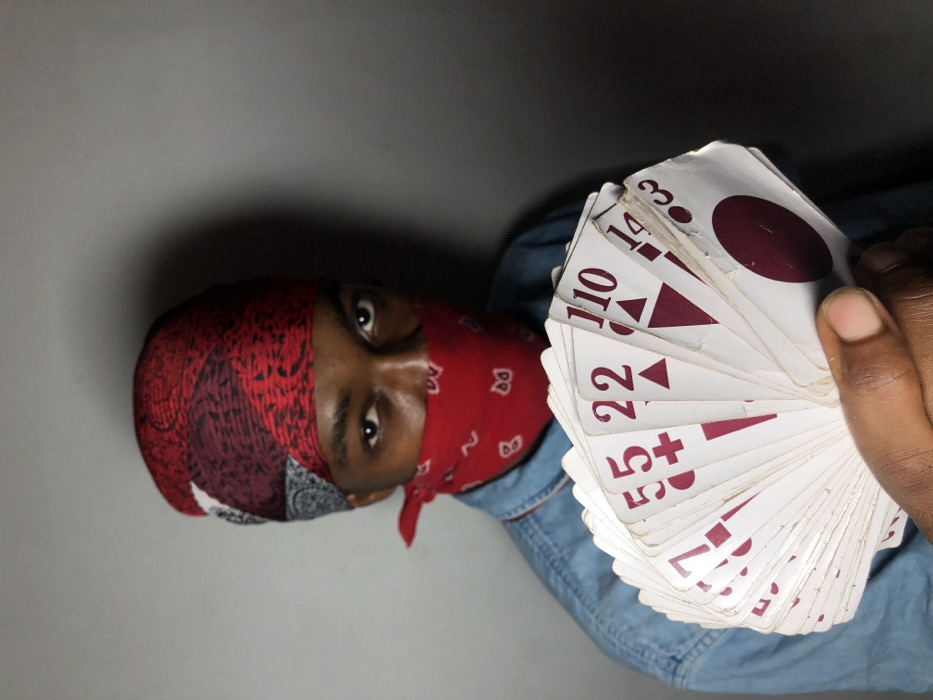 The image depicts a close-up portrait of an individual in Ngleshi Amanfro, Ghana. The person, with dark skin, wears a red and black patterned bandana as a head covering and a red bandana with white paisley designs over the lower half of their face, exposing only their dark eyes and eyebrows. They are wearing a light blue denim shirt. The individual's right hand, positioned in the lower center, holds a fanned spread of approximately 15-20 white playing cards with red/maroon markings. Visible card values include 7, 5, 22, 10, 110, 14, and 3, alongside symbols such as a plus sign, an upward-pointing triangle, a downward-pointing triangle, and a solid red circle. The cards show signs of wear. The background is a plain, solid grey wall, with lighting suggesting a source from the left, creating a shadow on the right side of the subject.