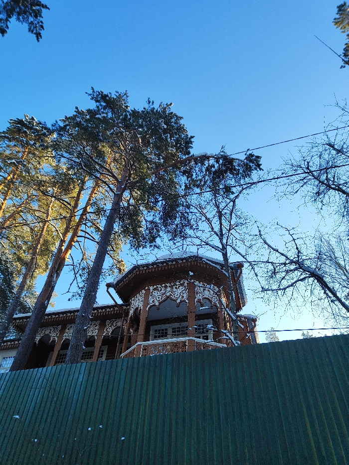 An upward shot frames a brown, ornately carved wooden house behind a corrugated green fence. The architectural style features elaborate details and a balcony. Tall pine trees, some dusted with snow, flank the building. Bare branches of other trees stretch towards the clear blue sky. Power lines intersect the scene. Sunlight illuminates the trees on the left, adding depth and highlighting the wintery atmosphere.