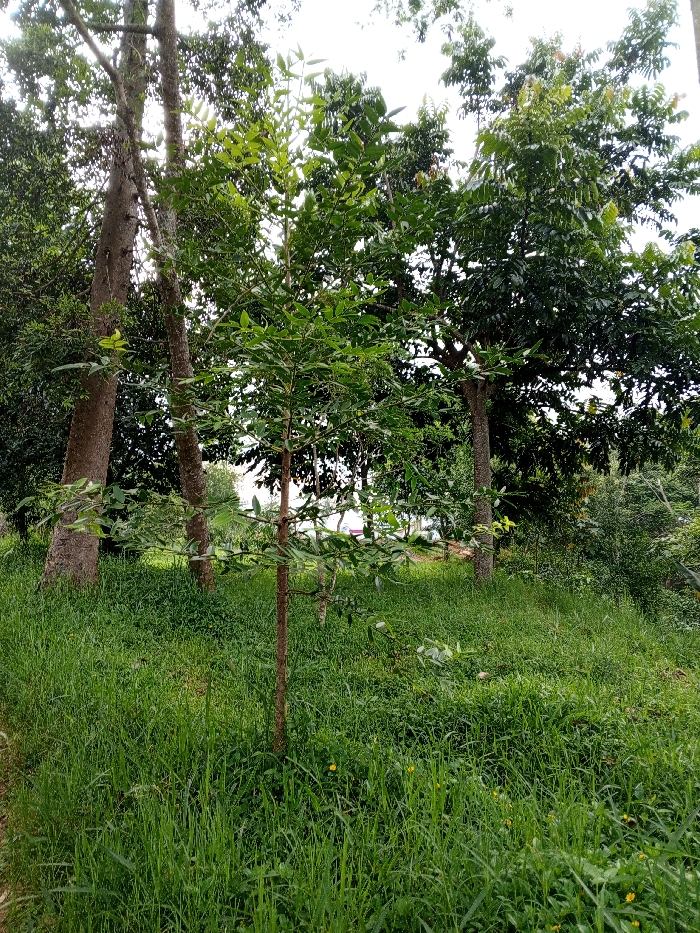 The image depicts a verdant, overgrown outdoor scene located in Thotagamuwa, Sri Lanka. The foreground is dominated by a dense, unkempt expanse of green grass and various low-lying plants, including some with small yellow flowers. A narrow, unpaved path runs along the far left edge of the frame. Centrally positioned in the mid-ground is a slender young tree with a light brown trunk and abundant green foliage. Behind it, and throughout the mid-ground and background, multiple mature trees with thicker, darker brown trunks and dense canopies of dark green leaves are visible. The two most prominent mature trees flank the young tree, one to the left and one to the right. The sky, visible intermittently through the tree canopy, appears bright and overcast. No people, animals, or man-made structures are distinctly visible within the immediate area of the scene, which exhibits a natural, untended environment.