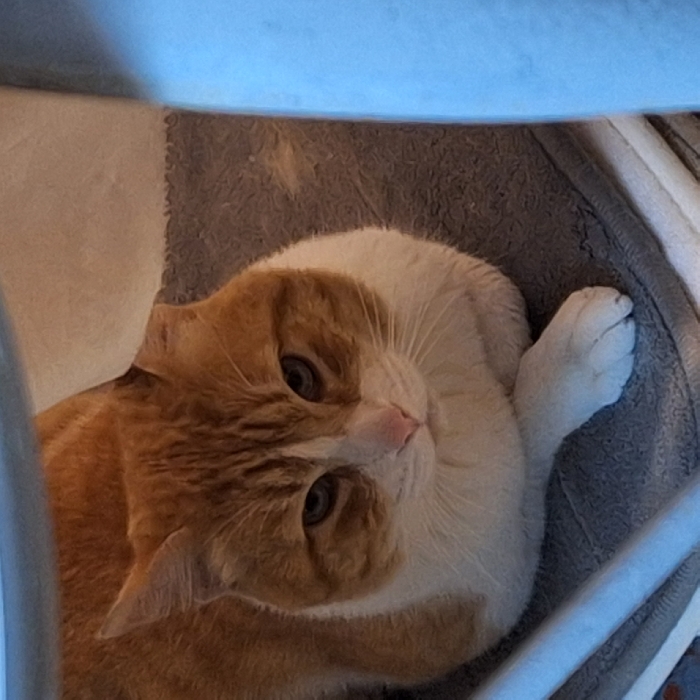 An orange and white cat curls in a bed. The cat has bright eyes, a pink nose, and an attentive expression. Part of its body is orange, the other part is white. The gray bed appears soft. A blue object partially obscures the upper portion of the frame, with some white bars in the lower right. The cat's paw is visible, extended next to its head.