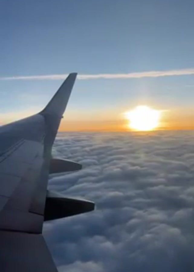 n airplane wing in flight, with a view of clouds below and the sun setting on the horizon. The sky is blue above the clouds, and a contrail can be seen in the upper part of the frame.