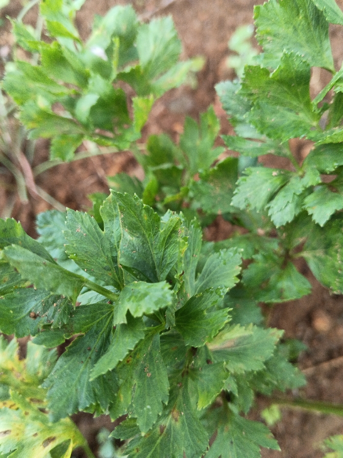 A close-up reveals vibrant green parsley growing in a garden. The leafy plant is densely packed with foliage. Brown soil surrounds the base. Some leaves show signs of minor discoloration. Overall, the parsley appears healthy and thriving.