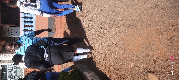 An outdoor scene depicts four individuals on a gravel and dirt surface in front of a building. The central figure, seen from behind, is a person wearing a black long-sleeved top, a black skirt, white knee-high socks, and brown shoes. To their right stands an adult male in a light blue and white striped polo shirt and blue trousers, holding a white paper in his left hand. To the far right, a person is seen from behind, wearing a white long-sleeved top with "BROGA 14" printed on the back, blue skinny jeans, and light blue and white athletic shoes. A fourth individual is partially visible on the far left, wearing a dark top and blue trousers, partially obscured by a low green bush. The background features a building with light-colored walls, barred windows, and a decorative blue railing. Strong shadows are cast on the gravel surface, indicating bright sunlight. The text "police kombo 💕💕" is visible in the bottom left corner of the image. The location is in the city of Unknown, Kenya.