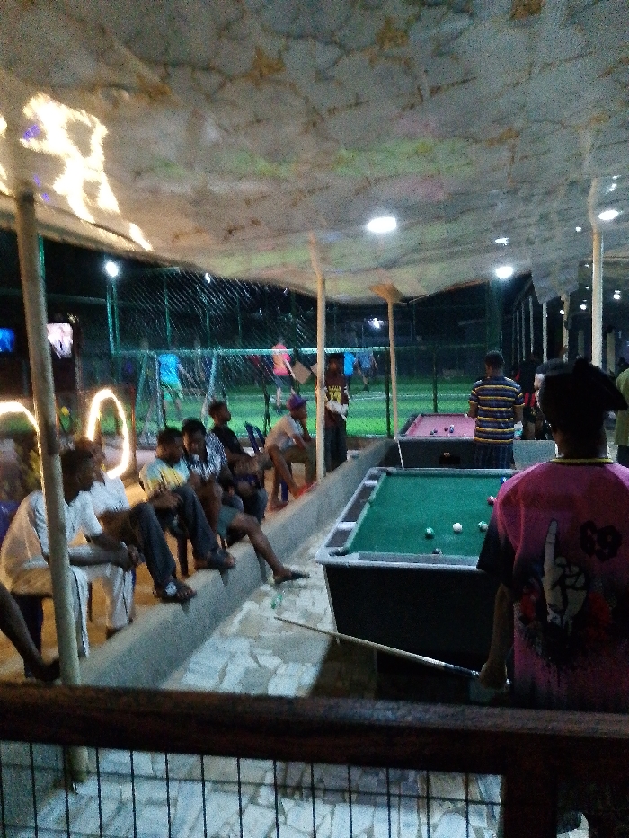 An outdoor recreational space at night, lit by artificial lights. Several people gather around two pool tables, one green and the other red. In the background, a group plays a sport on a green field, separated by a net fence. Some people are seated along a low wall, observing the activities. The area is covered by a canopy supported by posts.