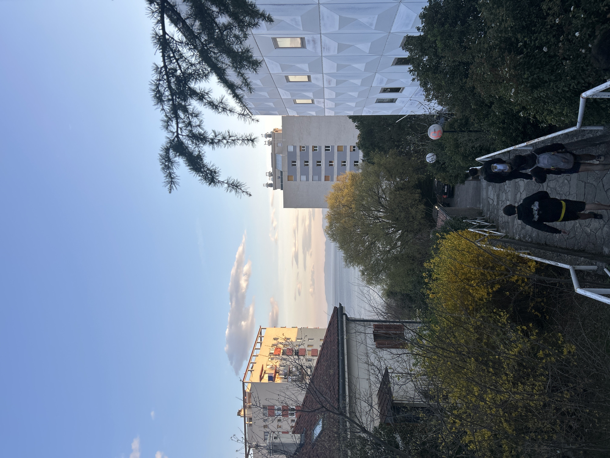 view in the city of Rijeka, Croatia. Several buildings of various heights and architectural styles are visible, including a tall white building with a geometric facade. There are trees with green and yellow foliage. A group of people is walking down a stepped path with white railings. The sky is blue with some clouds, and a body of water (possibly the sea) is visible in the distance.
