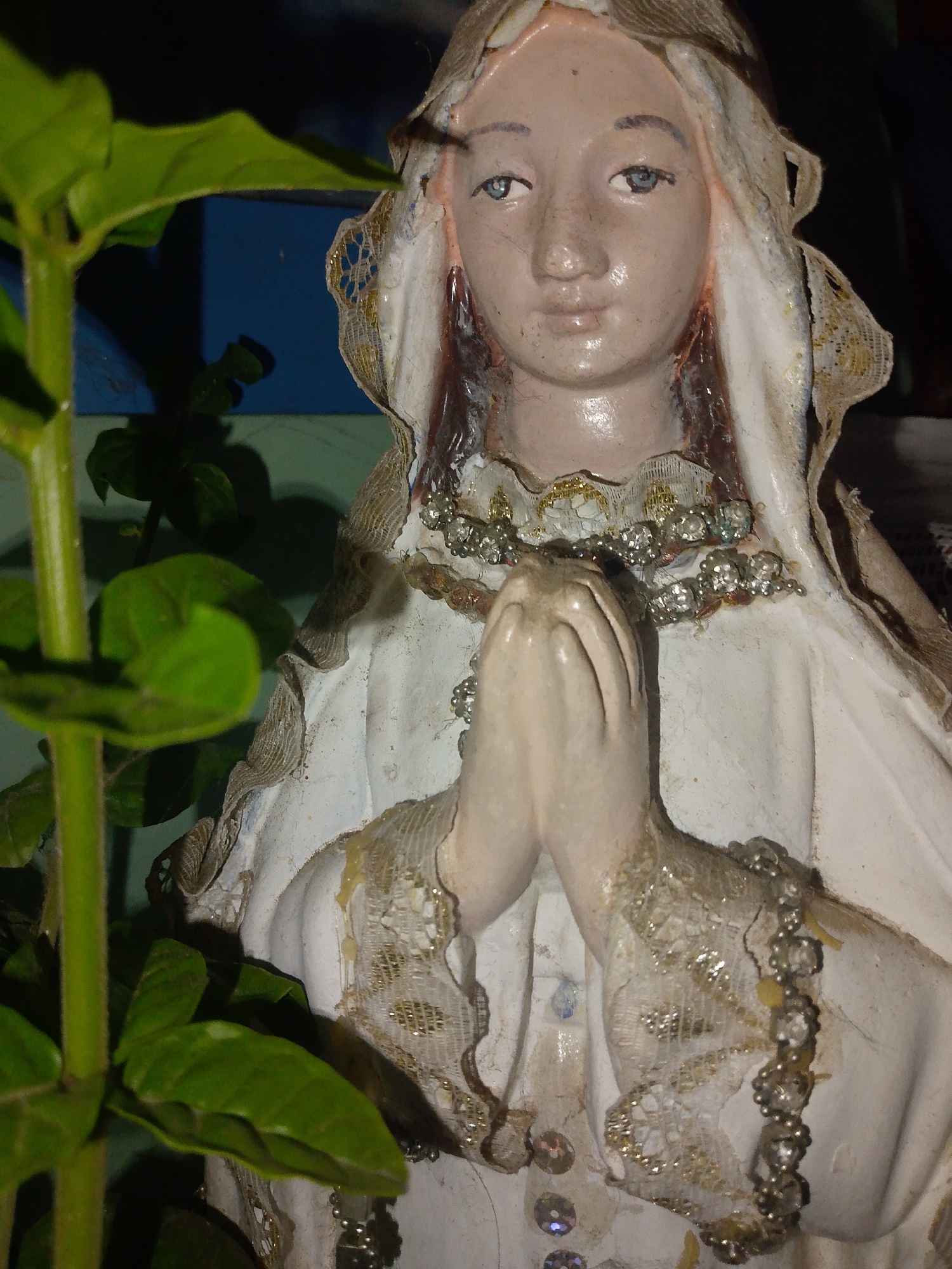 A statue of the Virgin Mary stands prominently in the frame, her hands clasped in prayer