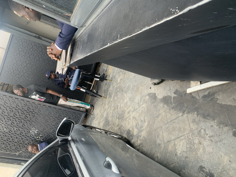 Three men are visible, one seated on a makeshift chair, another standing, and the third partially seen in the reflection of a car window