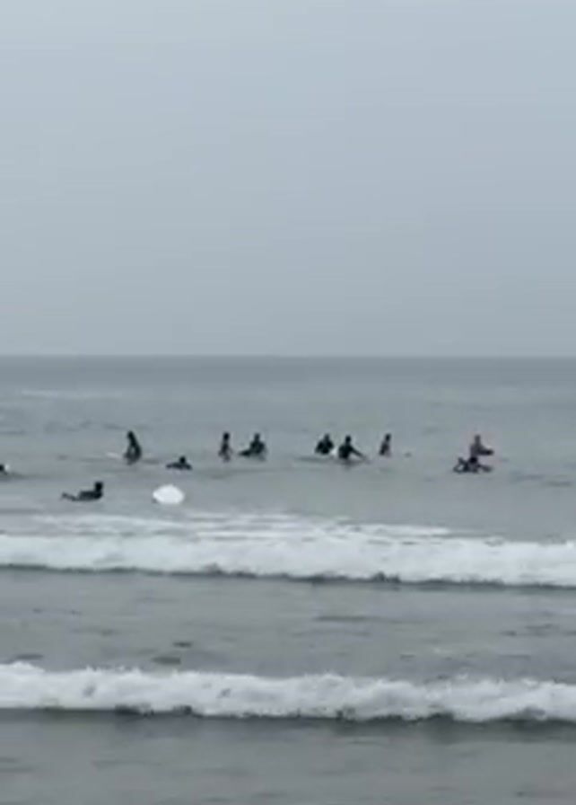 group of people surfing in the ocean on a cloudy day. There are at least fifteen individuals spread out on the water. Some are sitting or kneeling on surfboards, while others are swimming. Small waves are breaking in the foreground. The sky is overcast and the water is gray.