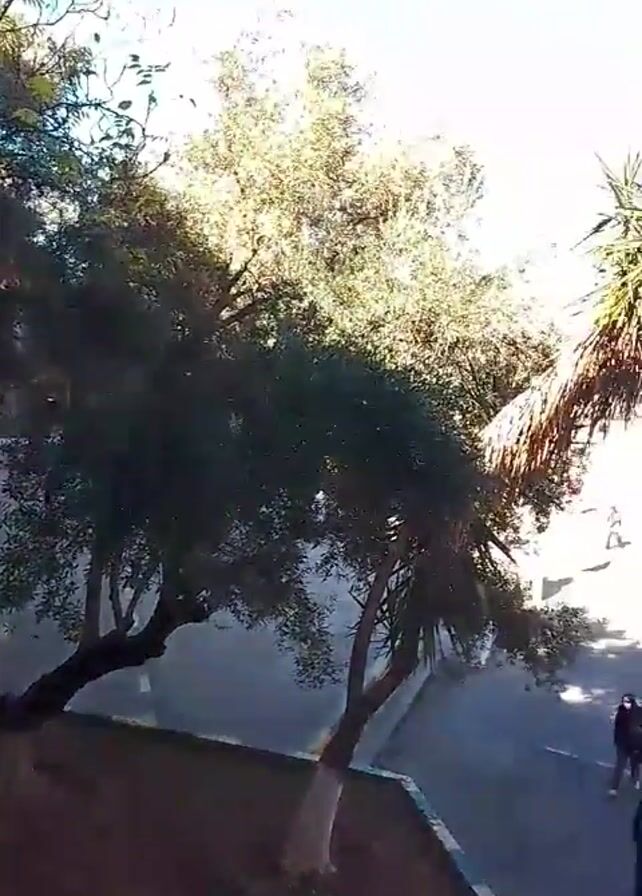 schoolyard on a bright, sunny day. Several students are walking around the courtyard. The school building is visible in the background, a long, light-colored structure with multiple windows. Various trees are planted throughout the courtyard, including pine trees, olive trees, and a palm tree. The ground is paved and partially shaded by the trees. The sky is clear and blue.