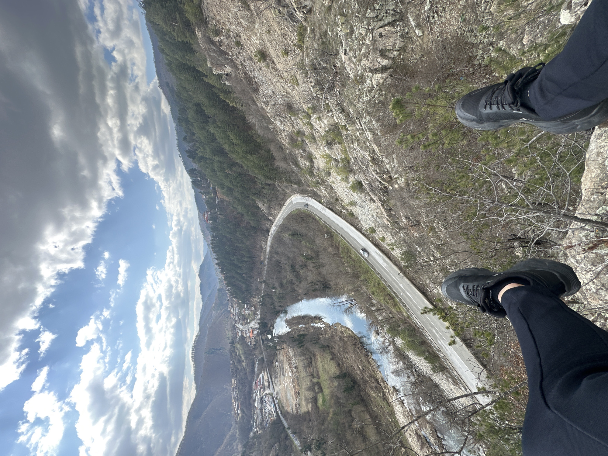 The image provides a high-angle, first-person perspective looking down into a valley in the city of Srednogortsi, Bulgaria. In the immediate foreground, the lower legs and feet of an individual are visible, clad in dark athletic pants and black athletic shoes, positioned over a rocky ledge. Below, a prominent river, likely the Topolnitsa River, winds through the valley floor, its surface reflecting the sky. Parallel to the river, a paved two-lane road curves through the landscape; a light-colored sedan is observed traveling on this road. The surrounding terrain consists of steep, rocky slopes with sparse vegetation, including bare deciduous trees and some evergreen shrubs and pines, indicative of late winter or early spring. In the midground and background, the valley opens to reveal the residential and industrial structures of Srednogortsi, nestled among forested hills and mountains that recede into the distance. The sky above is partially cloudy, with patches of bright blue visible through scattered white and grey clouds.