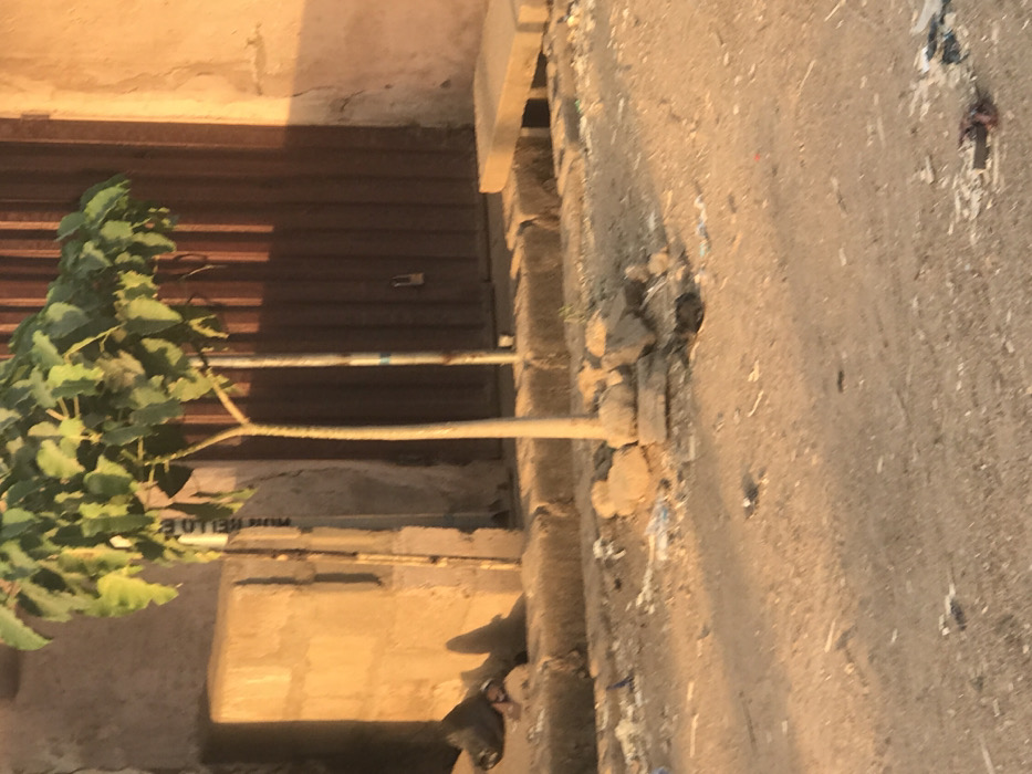 The image depicts a static outdoor scene in Sardauna, Nigeria, characterized by earthy tones under direct sunlight casting long shadows. Central to the frame is a slender tree with green, broad leaves, its light-colored trunk rooted in the dirt ground and reinforced at its base by several small rocks and debris. To the immediate left of the tree, a weathered concrete block structure stands, partially illuminated, with darker shadows behind it. On the ground near this structure, dark, indistinguishable objects are present. Behind the tree, a dark brown, vertically corrugated metal gate is visible, secured by a padlock near its lower center. To the right of the gate, a light-colored, possibly stuccoed wall shows signs of wear. Further to the right, a rectangular, light-colored concrete slab rests horizontally on the ground, partially covering an unseen opening or drain. A raised curb, constructed from concrete blocks, separates the dirt ground from the background structures. The foreground consists of a light brown dirt or gravel path, strewn with various pieces of scattered debris, including white and light-colored plastics, paper fragments, and darker organic matter. No people, animals, or discernible actions are present.