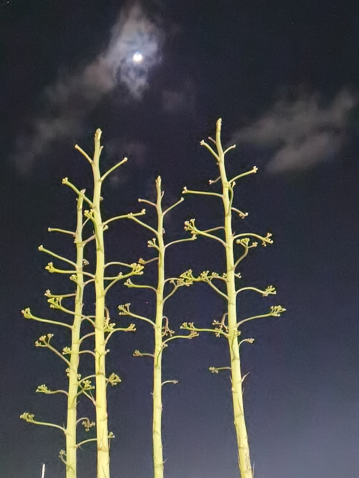 The image depicts a nighttime outdoor scene in the city of Bat Yam, Israel. Three prominent, light green to pale yellow agave flower stalks stand vertically, extending upwards from the bottom of the frame against a dark, deep blue night sky. Each stalk features numerous horizontally extending branches, many terminating in small, rounded bud-like or seed pod structures. The tallest stalk is positioned on the far right, a slightly shorter one in the center, and another on the left, with a partial fourth stalk visible on the extreme left. In the upper left quadrant of the sky, a crescent moon is visible, partially obscured by thin, wispy clouds. Several faint stars are discernible in the darker sky areas. The agave stalks are brightly illuminated, appearing to glow, suggesting direct artificial light sources are present in the immediate vicinity, contrasting with the ambient darkness of the night sky. No people, animals, or artificial structures are visible in the frame.