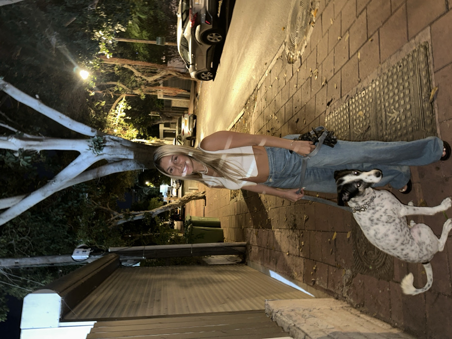 The image depicts a nighttime street scene in Ramat Gan, Israel. A young adult female, with long blonde hair and wearing a light-colored, sleeveless cropped top, light blue wide-leg jeans, and dark sandals, stands on a reddish-brown paved sidewalk. She is smiling directly at the camera. Visible tan lines are present on her left upper arm. She holds a gray dog leash in her left hand, connected to the dog, and a small, dark-patterned bag in her right hand. To her immediate left, a medium-sized dog with white fur and black spots, including a largely black head with white markings on its muzzle, is sitting on the sidewalk. The dog wears a silver-colored chain collar and looks towards the viewer's left. Its tail is curled upwards. The sidewalk is scattered with light brown leaves. To the left of the woman and dog is a low stone wall, followed by a light-colored building with horizontal siding. Further down the sidewalk on the left, two green garbage bins are visible next to a utility pole. Adjacent to the sidewalk is a paved street, illuminated by overhead streetlights. Several parked cars are visible in the background, including a silver Toyota C-HR SUV parked on the right side of the street. Numerous trees with varying bark textures and foliage line the street, one prominently displaying light-colored bark and another exhibiting hanging aerial roots. The sky is dark.