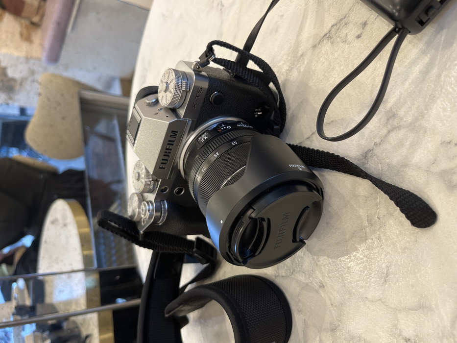 A silver and black Fujifilm X-T5 camera lies on a marble surface