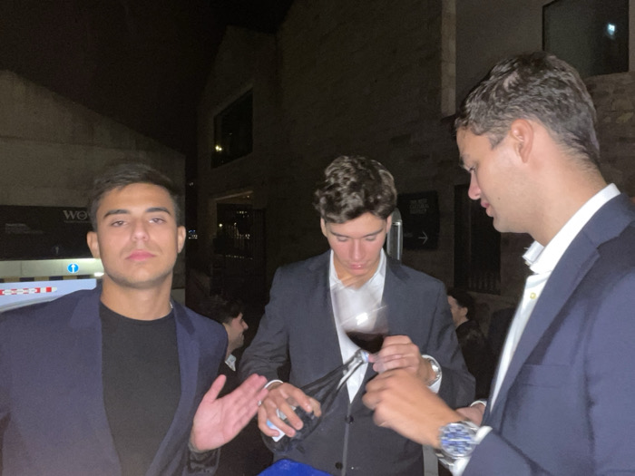 The image depicts three men in semi-formal attire at night, within the World of Wine (WOW) complex in Vila Nova de Gaia, Portugal. The man on the left, a young adult with dark hair, wears a dark blue suit jacket over a black t-shirt. He faces forward, looking directly at the camera with a neutral expression, his right hand raised with the palm open in a gesturing motion. The man in the center, a young adult with dark wavy hair, wears a dark suit jacket over a white collared shirt. He is focused downwards, holding a clear wine glass containing red liquid in his left hand. His right hand is manipulating a dark object near the base of the glass; a motion blur is visible around the glass and his hands. The man on the right, an adult male also in a dark blue suit jacket and a white collared shirt, is partially visible from the chest up, facing towards the central figure. His left arm is extended towards the center, and he wears a large silver watch with a blue dial on his left wrist. The background consists of dark building structures. To the left, a sign with the partial white text "WE" (likely part of "WOW") is visible above a white and red striped barrier. In the mid-background, a directional sign with an arrow pointing right is present. The overall environment is dimly lit, suggesting artificial illumination at a social gathering or event. Other indistinct figures are visible in the darker background areas.