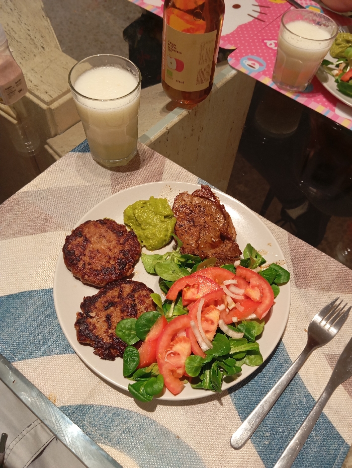 A plate on a patterned mat features two patties, guacamole, steak, and salad with tomato and onion. Beside the plate, there is a fork and knife. Adjacent, a table with a glass of white liquid, a bottle of amber liquid, and another glass of white liquid. The table has a Hello Kitty placemat with a small salad plate.