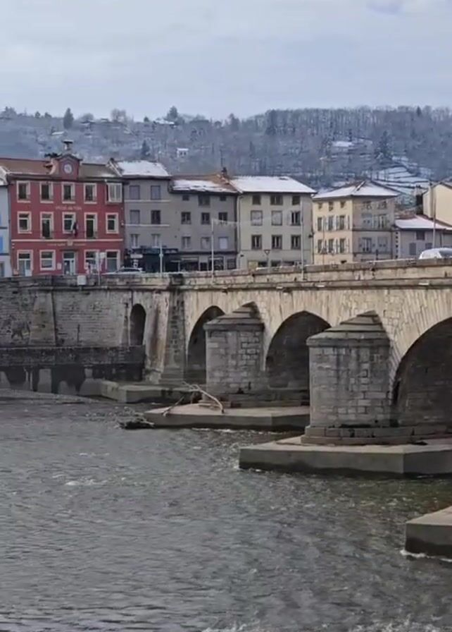 river flowing beneath a stone arch bridge in a town, with the buildings on the opposite bank having snow-covered roofs. The river is dark and choppy, with concrete structures visible at the base of the bridge piers. The buildings are a mix of colors and architectural styles, with a snow-covered hill rising behind them. The sky is overcast.