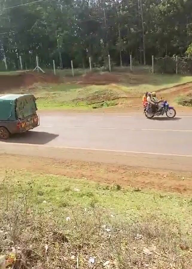 gray truck with a green-covered bed driving on an asphalt road lined with green grass and trees. In the first scene, a motorcycle is seen driving in the opposite direction of the truck. The video then shows the truck driving away, followed by another motorcycle with two riders passing by. Finally, a silver pickup truck drives by in the opposite direction. The video is filmed from a slightly elevated position on the side of the road. The sky is cloudy.